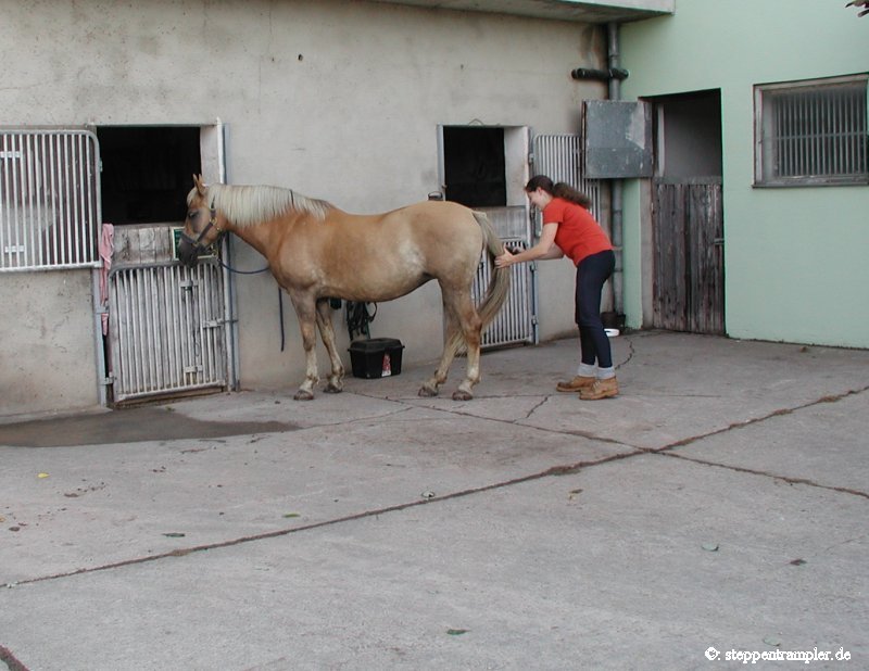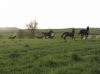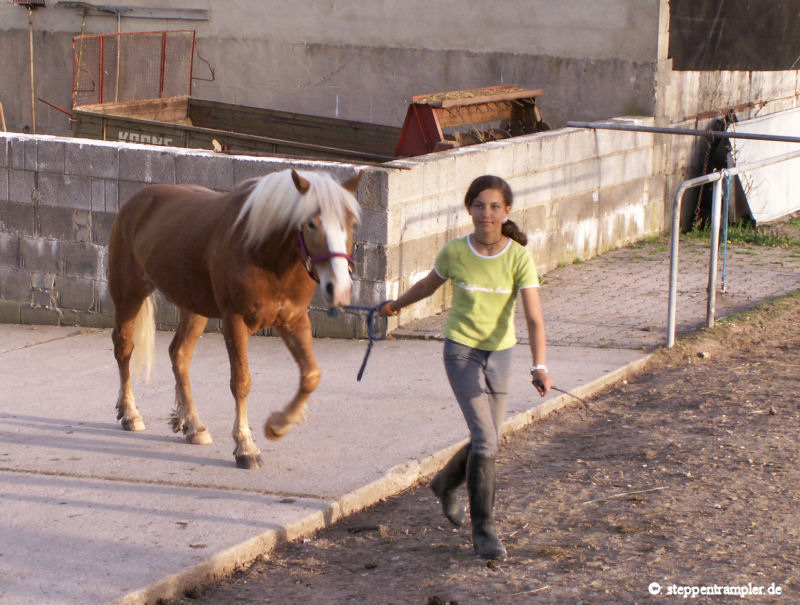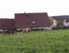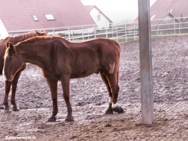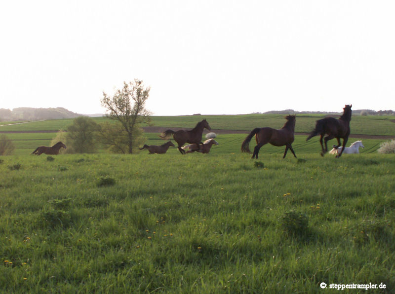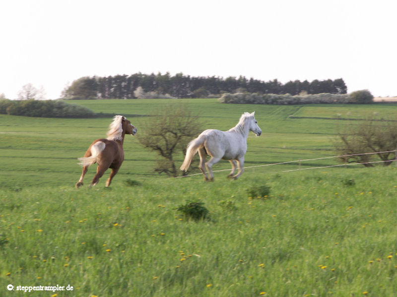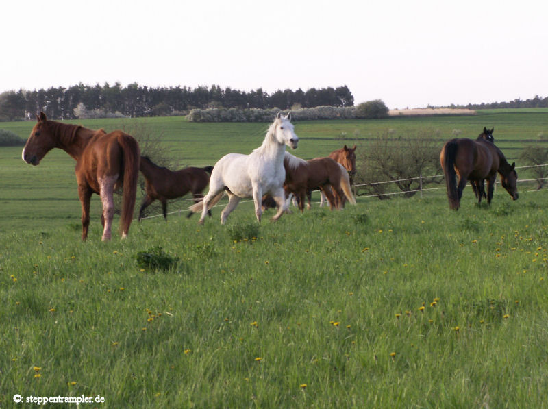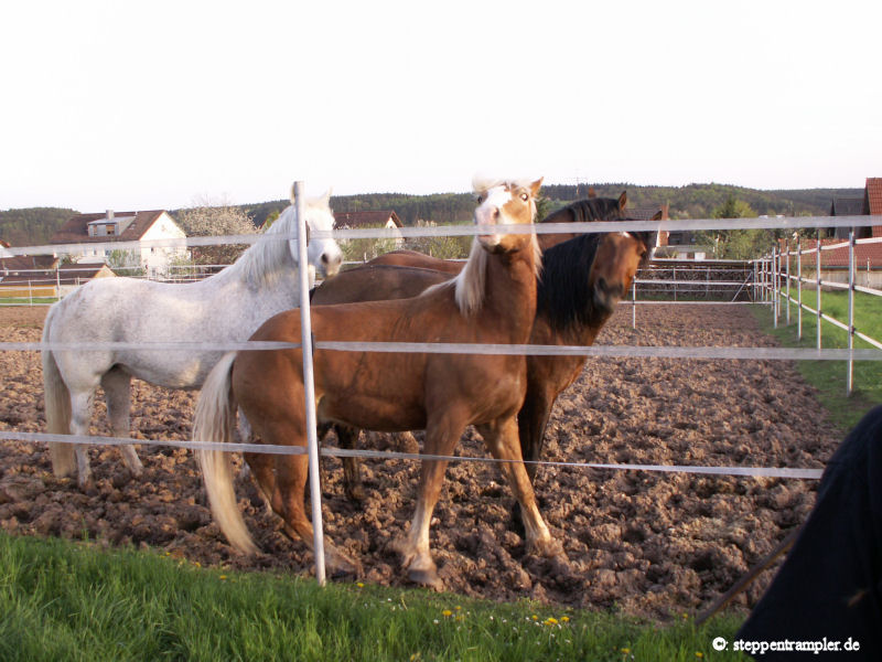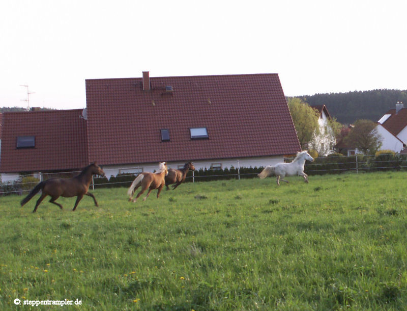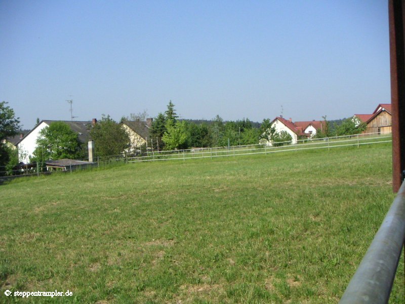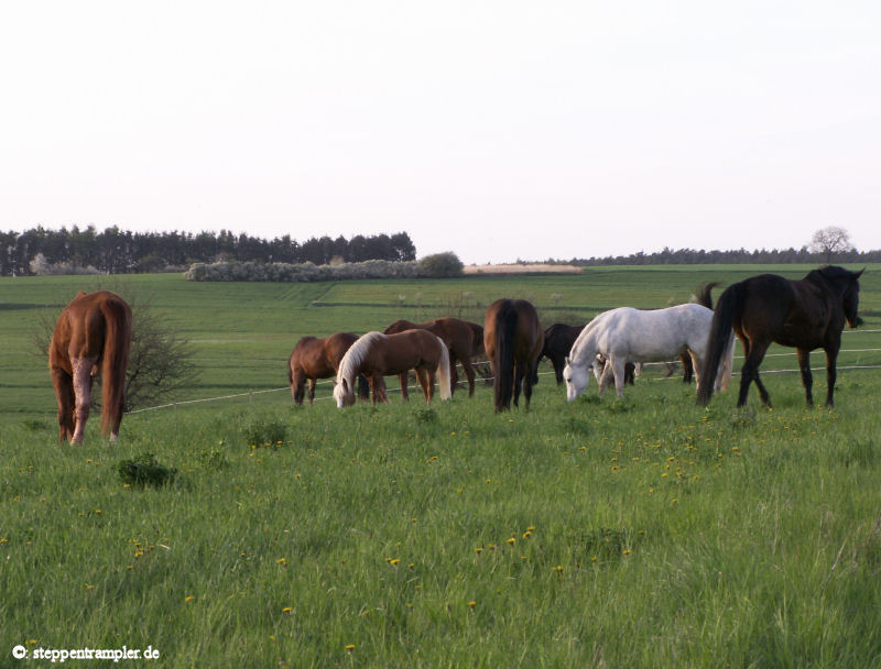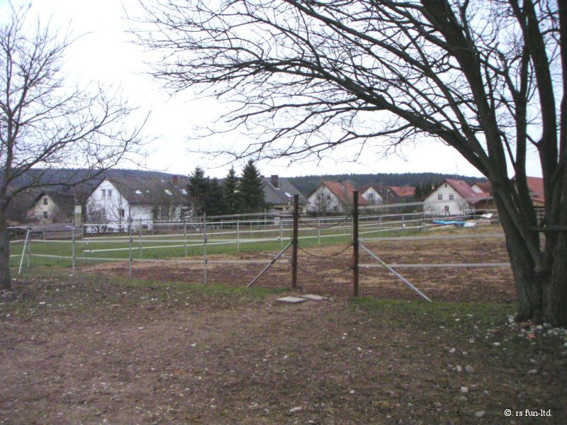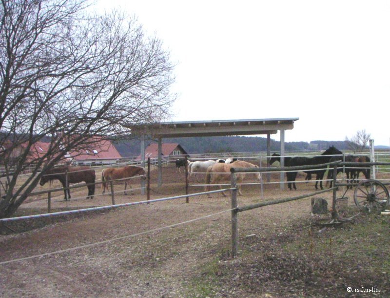 Auf fast drei Seiten, direkt am Stall angrenzend befinden sich die großzügigen Koppeln, die vorderste ist mit einer Überdachung versehen, alle mit Elektrozaun umzäumt, und ebenso alle ausgerüstet mit Tränkern für die Pferde. Die Tiere befinden sich von Mitte/Ende September bis Mitte Mai tagsüber auf den Koppeln, nachts im Stall, und werden früh und abends mit Hafer und Heu gefüttert, im Sommer stehen die Pferde ganztägig auf der Weide. Die Bilder vermitteln einen kleinen Eindruck der gasamten Weidefläche. |