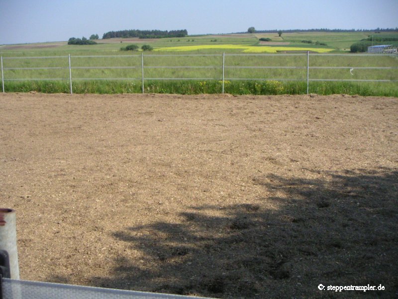 gegenüber der Scheune der speziell abgeteilte Reitplatz, der vielfältige Reit- und Trainingsmöglichkeiten bietet |